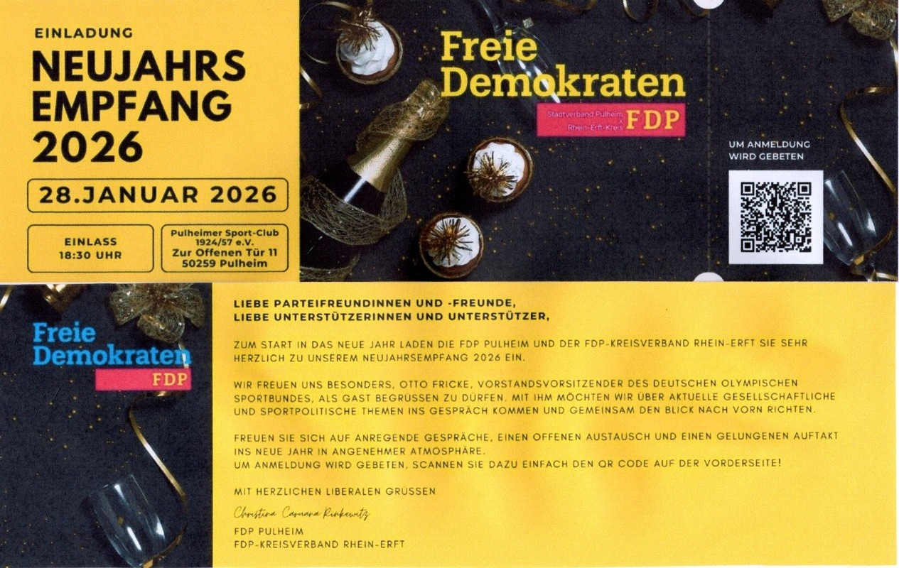 Zum Start in das neue Jahr laden die FDP Pulheim und der FDP-Kreisverband Rhein-Erft Sie sehr herzlich zu unserem Neujahrsempfang 2026 ein, der